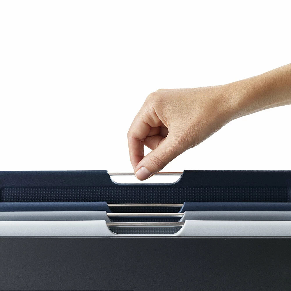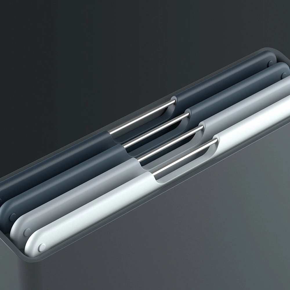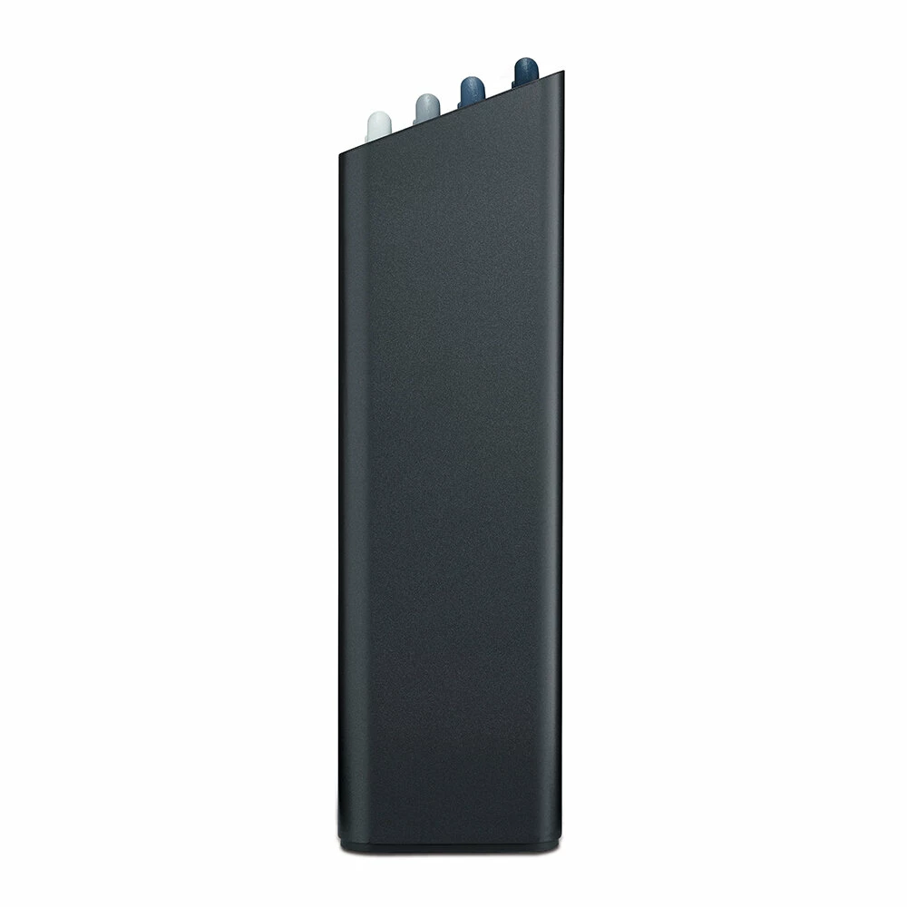Save kitchen work surface space and ensure effortless hygienic food preparation with Joseph Joseph’s Folio Chopping board set. This contemporary design features a slimline case that keeps the four chopping boards organised and to hand on your worktop. Each colour-coded board features a knife-friendly textured cutting surface and non-slip feet. Due to the smart angled design of the stainless-steel selecting bars, each board is easy to grab from the case. The case itself holds them nearly apart, allowing air to circulate and also features non-slip feet.