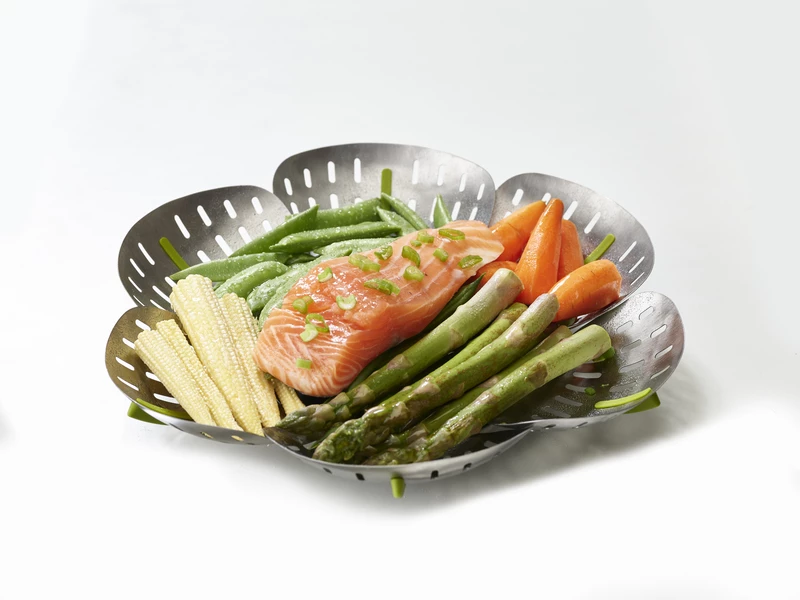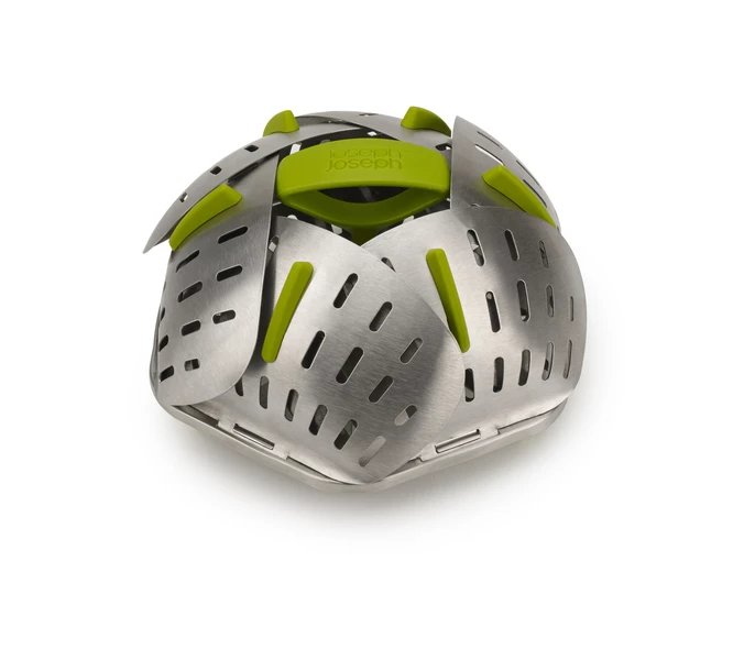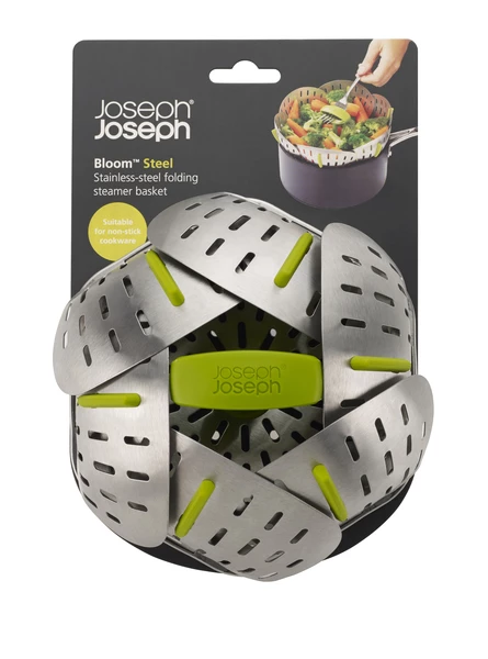 Bloom™ steamer basket now comes in extra durable stainless-steel. With its self-adjusting sides, heat-resistant silicone feet and side fins, this folding steamer basket is perfect for using with both non-stick and stainless-steel cookware.