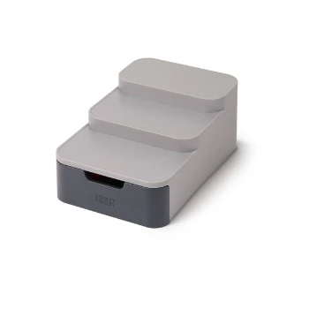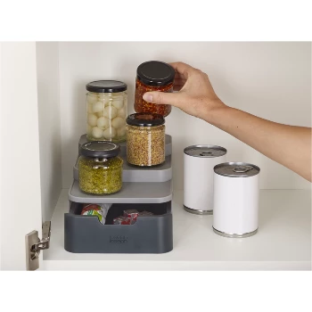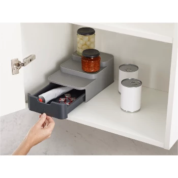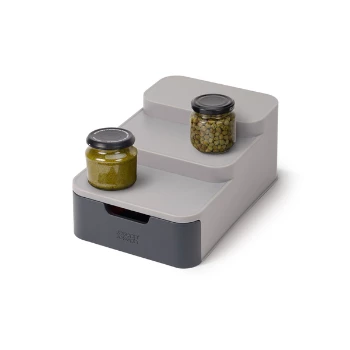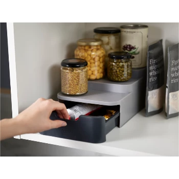 Organise your cupboard chaos with this practical storage solution. It features a tiered design that improves visibility and access to jars and tins at the back of the cupboard and a handy drawer for hard-to-store items such as loose stock cubes, small packets and food paste tubes. Its compact size also makes it perfect for smaller cupboards.