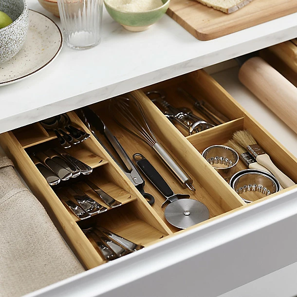 Combines five overlapping compartments for storing cutlery with three deep-sided compartments for holding utensils and gadgets.