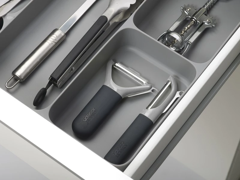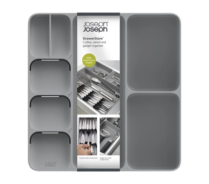 DrawerStore™ cutlery and utensil organiser combines five overlapping compartments for storing cutlery with three deep-sided compartments for holding utensils and gadgets. The clever design makes the most of the space you do have in your kitchen drawers and keeps everything neat and tidy.