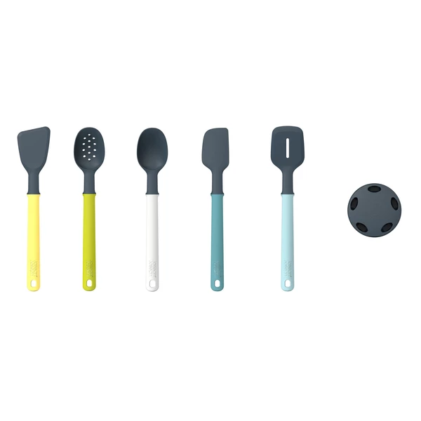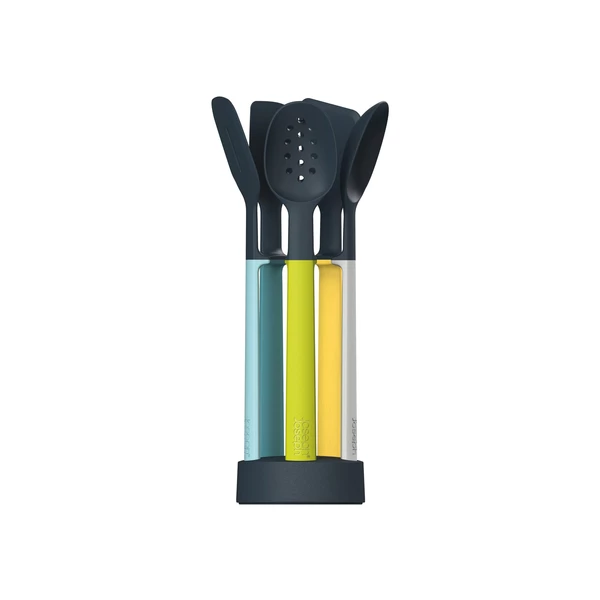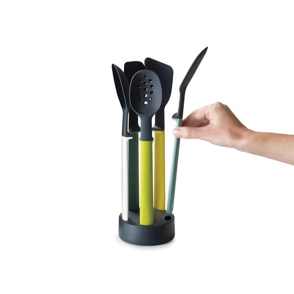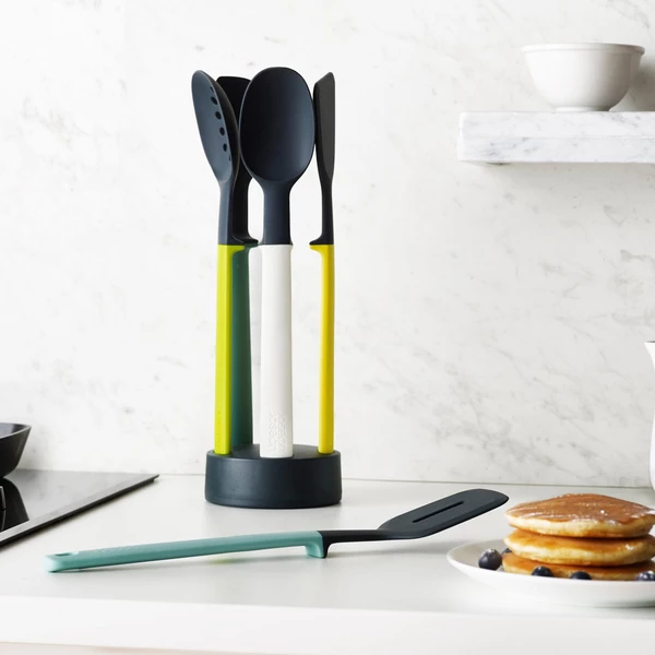 Perfect for a housewarming gift or for those who want to refresh their kitchen kit and save some precious drawer space. Each tool in the set has an integrated tool rest for improving hygiene and reducing mess. The set contains a solid spoon, a paddle, a spatula, a slotted spoon, a slotted turner, and a compact stand. Each tool has a flexible silicone head which is heat-resistant up to 270°C and nylon handles which are heat-resistant up to 200°C. Tools – dishwasher safe Stand – wipe clean only BPA free Dimensions – H13 x W32.5 x D13cm (H5¼ x W13 x D5¼ inches)