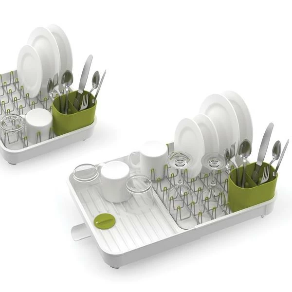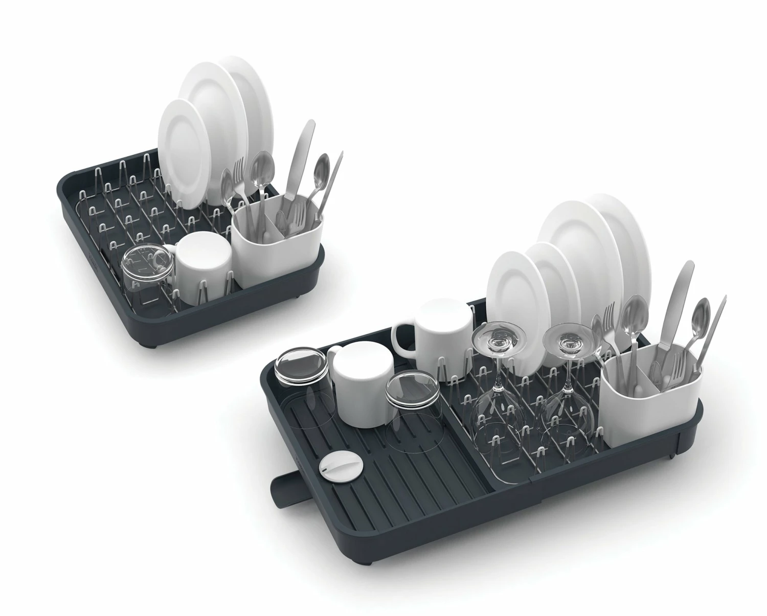 Ideal for smaller kitchen spaces, Joseph Joseph’s sleek dish rack features a 2-part sliding tray that extends to provide more room for larger loads of dishes. Ingeniously equipped with a range of useful details – raised ribs to prevent water being trapped beneath glassware, non-scratch draining prongs, a moveable cutlery drainer, a draining spout with 3 different positions, and more – this sleek utensil makes a savvy choice for any well-organised kitchen worktop.