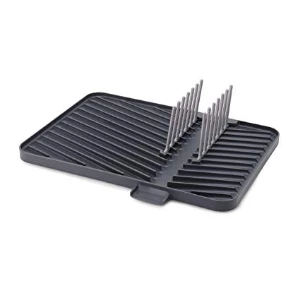 This clever draining board by Joseph Joseph includes a handy pop-up plate rack that locks into place for stability so you can drain up to 6 dinner plates as well as a variety of cups, glasses and bowls. The non-slip feet on the base ensures that even when placed on a wet surface, the unit stays in place, and after use, the rack can be folded neatly away for compact storage. Features a ribbed surface to prevent water being trapped in the mouths of containers. The sloping base also channels water away, while the integrated spout drains directly into the sink meaning your crockery dries more effectively.