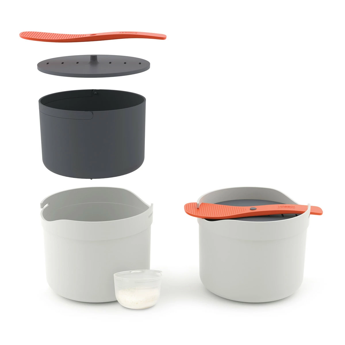 Another sleek and practical device by Joseph Joseph! The Microwave Rice Cooker holds a capacity of 2L and is the perfect aid for cooking rice quickly and easily. The rice pot with lid comes with a spoon, a colander and a measuring cup. The spoon cleverly doubles up as a lock and handle. Height: 14.5 cm, Depth: 18 cm, Length: 18.5 cm. The Microwave Bowl by Joseph Joseph is made of polypropylene and is therefore especially durable, dishwasher-safe and microwave-resistant up to 900 watt. Please note that the rice pot may be very hot when removed from the microwave. It is advisable to handle the pot with cooking gloves or oven mitts after heating.