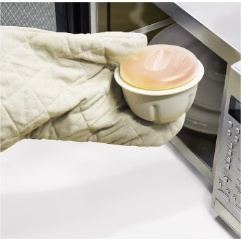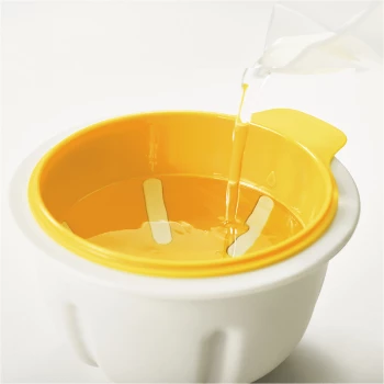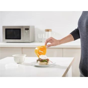 Preparing poached eggs in a pan can be a tricky but cooking them in water usually gives the best results. This can be quickly and easily replicated in a microwave oven with this clever design. Simply fill the poacher with water, heat briefly in the microwave and then break in an egg. Cover with the lid and microwave on full power for the specified time. To serve, simply lift and drain the cooked egg with the integrated colander. Full cooking instructions included.