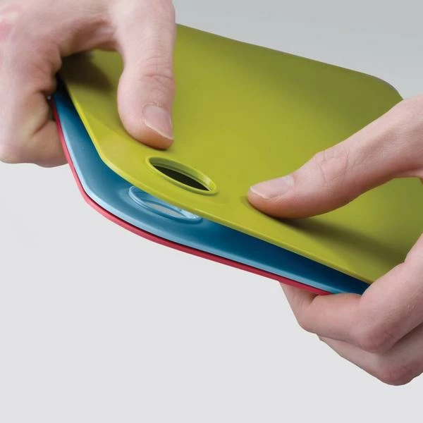These chopping mats are ideal for a variety of food preparation tasks and neatly clip together for tidy storage. Each mat has a double-sided, knife friendly cutting surface and is clearly colour coded The hole detail is designed to allow the boards to be joined by simply pushing together and provides an ideal hanging point Flexibility means the mats can be easily bent or folded to direct chopped food into a pan or food waste into a bin Care & use: Dishwasher safe Knife friendly surface of the mats is designed to mark slightly during use BPA free Dimensions: (Regular): H24 x W34 x D0.6cm (H9½ x W13½ x D¼ inches) (Large): H29.2 x W39.3 x D0.6cm (H11½ x W15½ x D¼ inches)