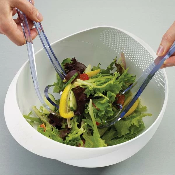 This clever bowl combines the functions of a preparation bowl, colander and a serving bowl all in one convenient design. Multi-function bowl with integrated colander Rinse, drain, mix and serve food in one bowl Ideal for preparing and serving salads and soft fruits or for rinsing and draining rice and lentils prior to cooking Easy-tip edge Care & use: Dishwasher safe Not microwave safe Heat-resistant up to 80°C (176°F) Caution – do not use with boiling water BPA free