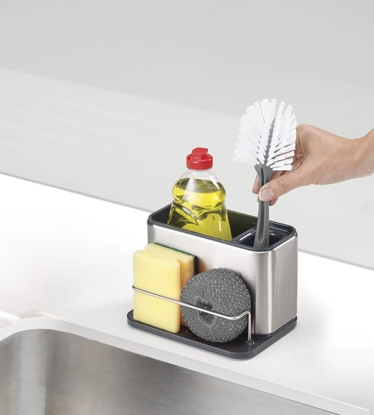 A clever accessory for storing your sponges, washing brushes, dishcloths and washing up bottles neatly beside your sink with separate compartments for each.