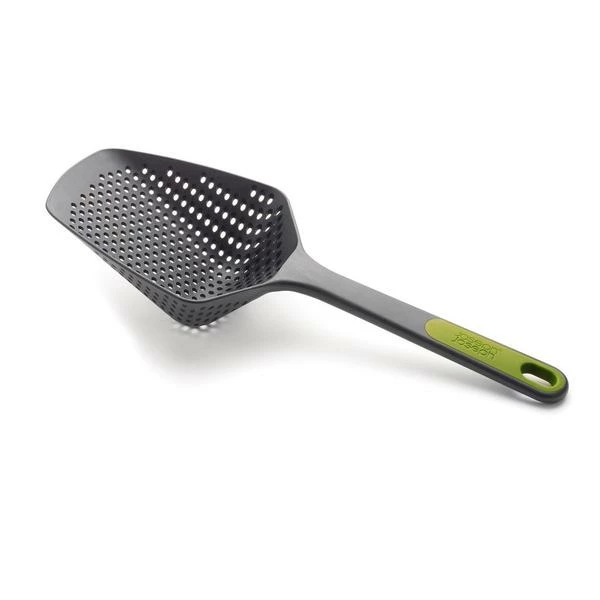 This simple kitchen utensil allows you to scoop, drain and serve food straight from a hot pan or baking tray. Scoop and drain straight from a hot pan Discreet pan hooks allow tool to rest on the side of a pan to drain Ideal for straining and serving vegetables, pasta and fried food Made from toughened nylon, suitable for non-stick cookware and heat resistant up to 200°C (392°F) Care & use: Dishwasher safe Remove cookware from heat source before resting utensil on top BPA free Dimensions: H7.5 x W34 x D13cm (H3 x W13½ x D5¼ inches)