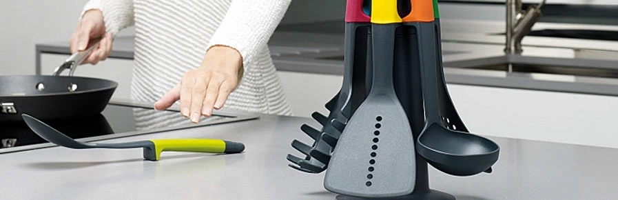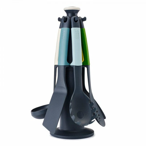 Joseph Joseph’s Elevate Carousel Kitchen Utensils range of kitchen tools has been specifically designed to improve hygiene and minimise the mess made by placing utensils onto kitchen surfaces during use. Each tool has an innovative, weighted handle with an integrated tool rest, ensuring that when an Elevate utensil is placed down, its head is always raised from the work surface.
