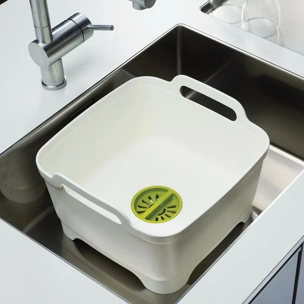 Colour: Grey This smart washing up bowl comes with its own strainer plug, meaning you won’t have to lift to drain and can stop food blockages in your kitchen sink. Removable plug feature allows you to drain or strain water, eliminating the need to lift or empty a heavy bowl Straining plug catches large food particles, helping to prevent sink blockages Steep bowl sides keep water and soap suds inside Large handles on the bowl make carrying easier and safer Care & use: Hand wash only BPA free Dimensions: H20 x W31.5 x D31cm (H8 x W12½ x D12¼ inches)