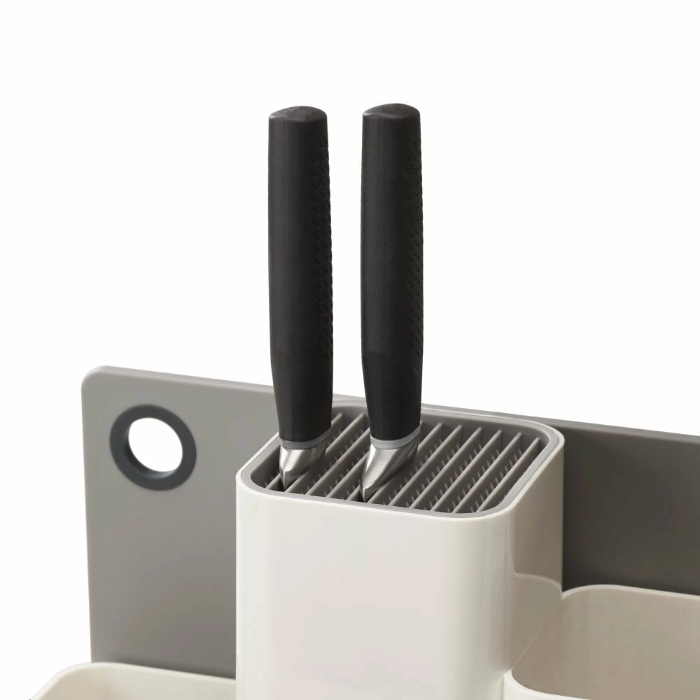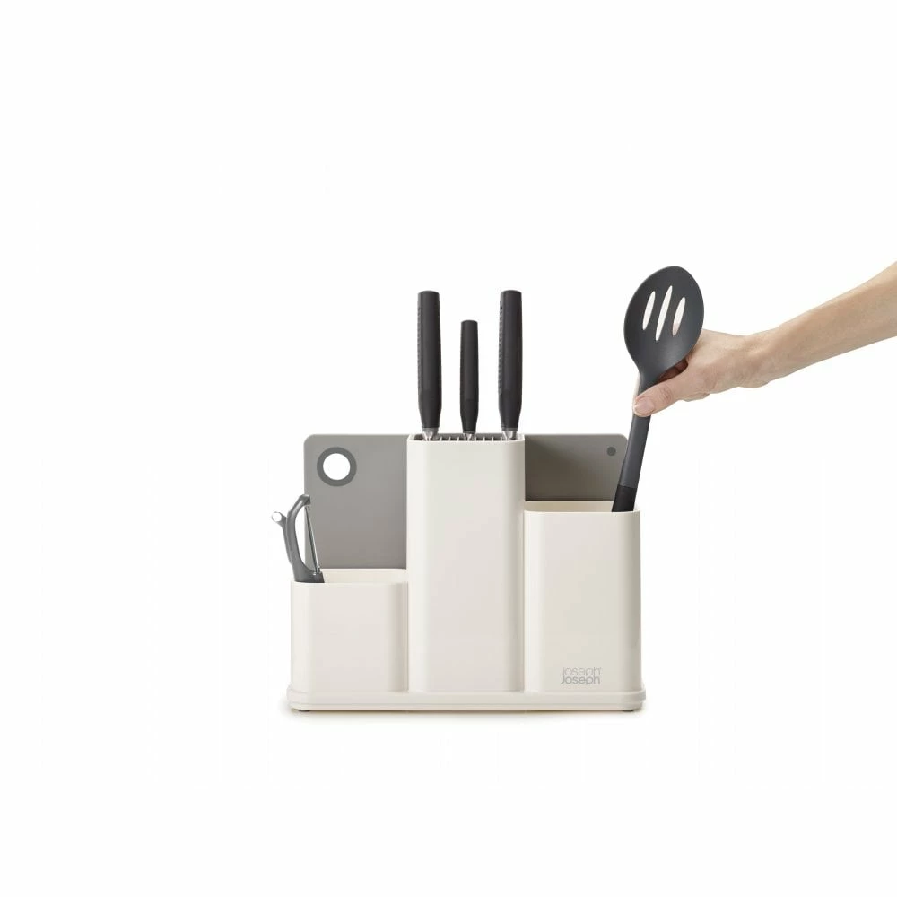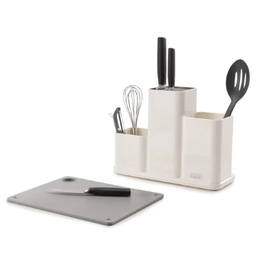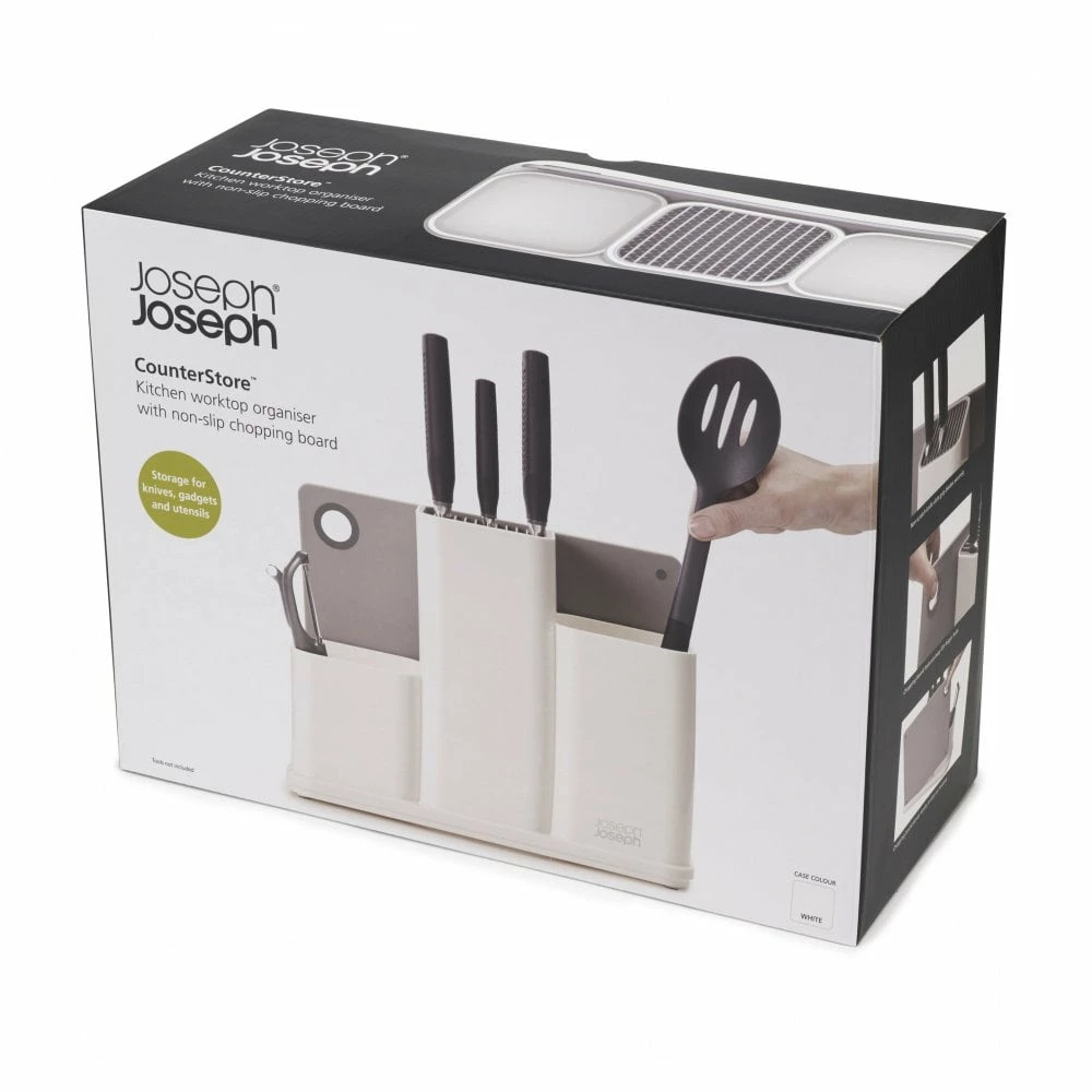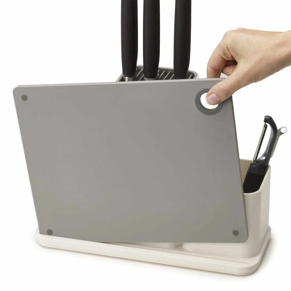 The compact CounterStore from Joseph Joseph is perfect for those with limited space in their kitchen area. The central knife store features non scratch slots that grip knives securely and two further compartments are available for other tools and gadgets. Tucked neatly behind these is a knife friendly, non slip chopping board with a convenient grip hole in one corner. A fabulous addition to your kitchen and also make an ideal gift for the foodie in your life.