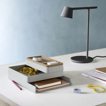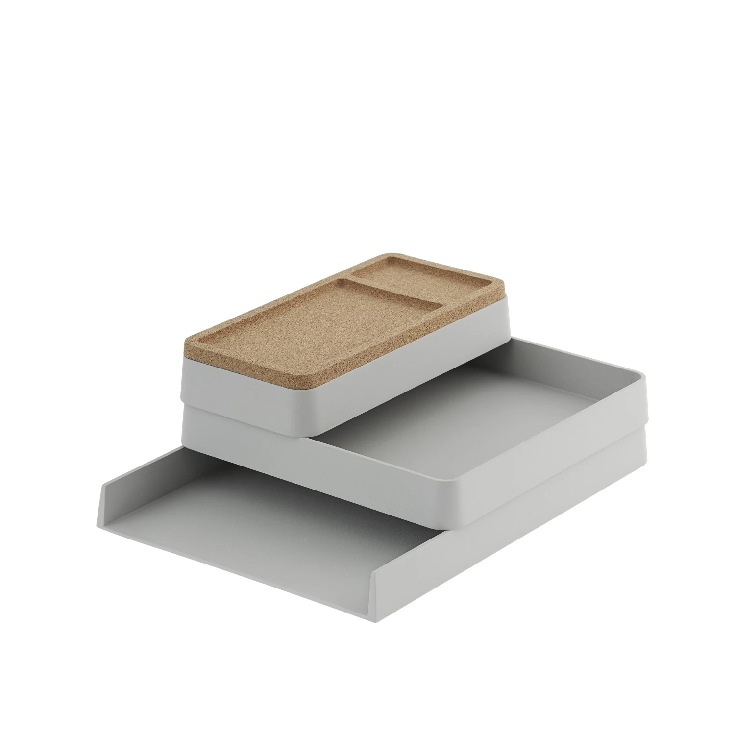 The Arrange Desktop Series is a configurable design that brings elegant functionality to the home office and workplace through its playful character and architectural expression. With its trays in 100% recycled plastic alongside lids in either cork or anodized aluminum, the Arrange Desktop Series brings a sustainable perspective to modern storage.