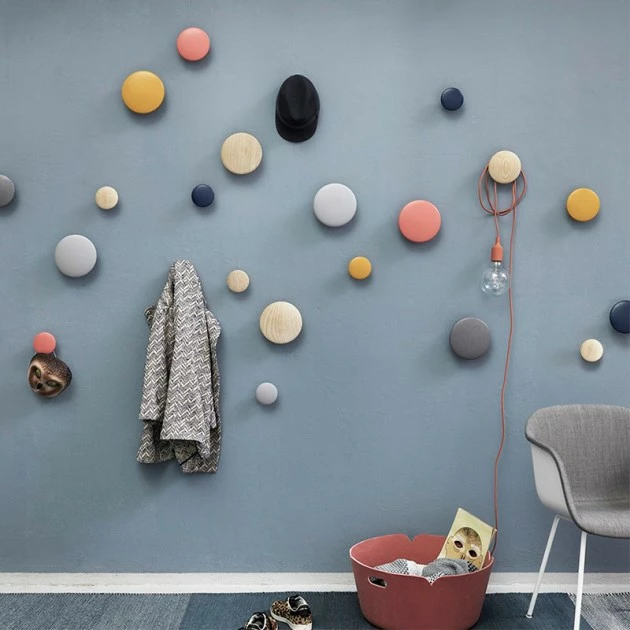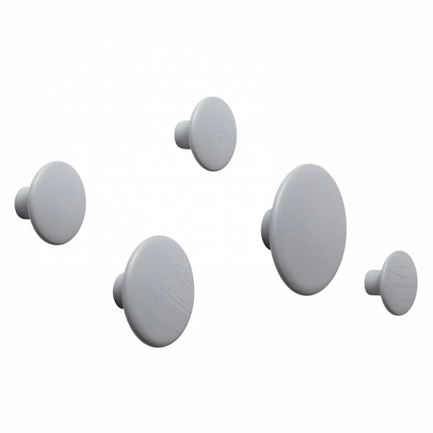 Muuto Dots wall coat racks are a bestseller thanks to their attractive and fun design. We propose you the set of 5 coat racks, it combines 1 unit of diameter 17 cm, 1 unit of 13 cm and 3 units of diameter 9 cm, all of them with the same finish. Place them together at different heights, aligned, play with them and create a unique wall in which to leave your coat or purse when you get home. They also decorate the wall of your bedroom, office or business.